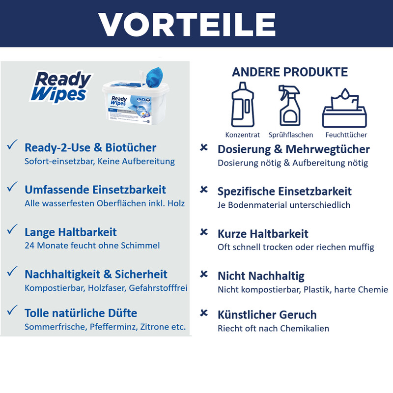 - Can be used immediately without incorrect dosage: the 5-in-1 ReadyWipes can be used immediately and already contain the perfectly pre-dosed combination of cleaning agents, moisture, scent and care products.