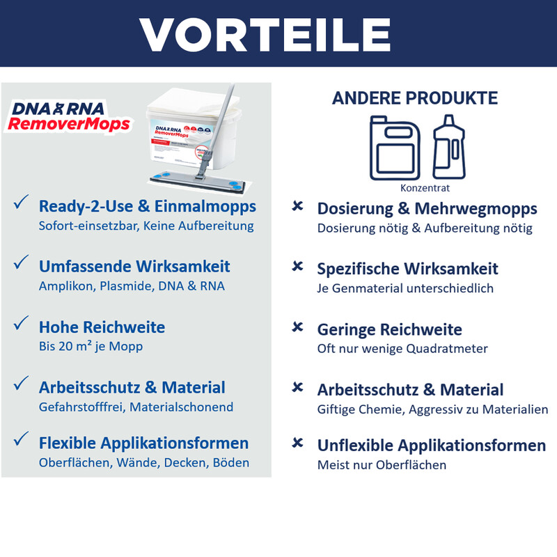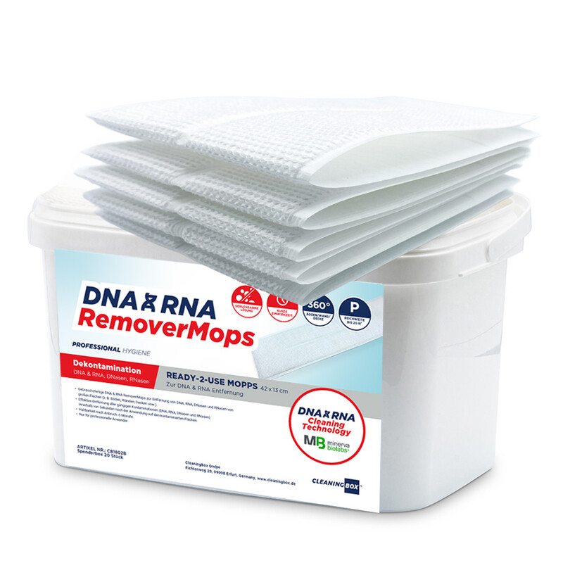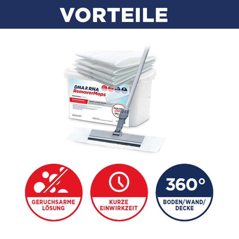 • Gebrauchsfertige DNA & RNA RemoverMops zur Entfernung von DNA, RNA, DNasen und RNasen von großen Flächen (z. B. Böden, Wänden, Decken).