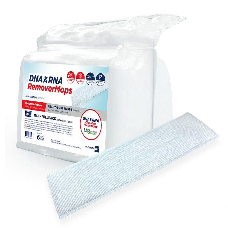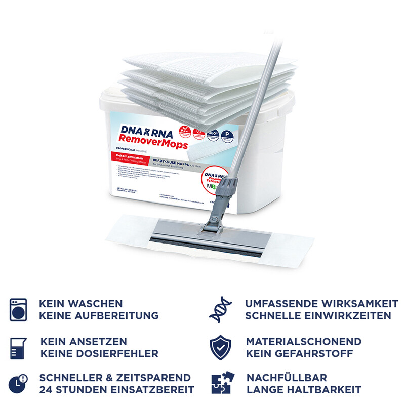 Ready-to-use disposable mops for disinfection and cleaning of floors and hard surfaces. DesiMops disinfection mops are comprehensively effective: sporicidal, virucidal, bactericidal, fungicidal under high load. Range per mop 20 m². Disinfection solution made of low-odor peracetic acid is 99.8% biodegradable and not a hazardous substance.