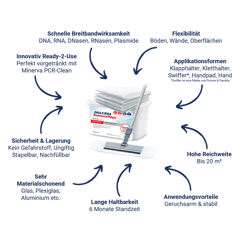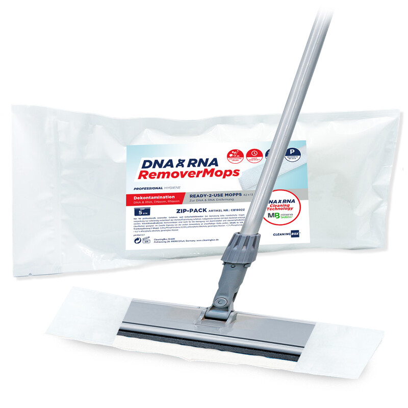 • Gebrauchsfertige DNA & RNA RemoverMops zur Entfernung von DNA, RNA, DNasen und RNasen von großen Flächen (z. B. Böden, Wänden, Decken).