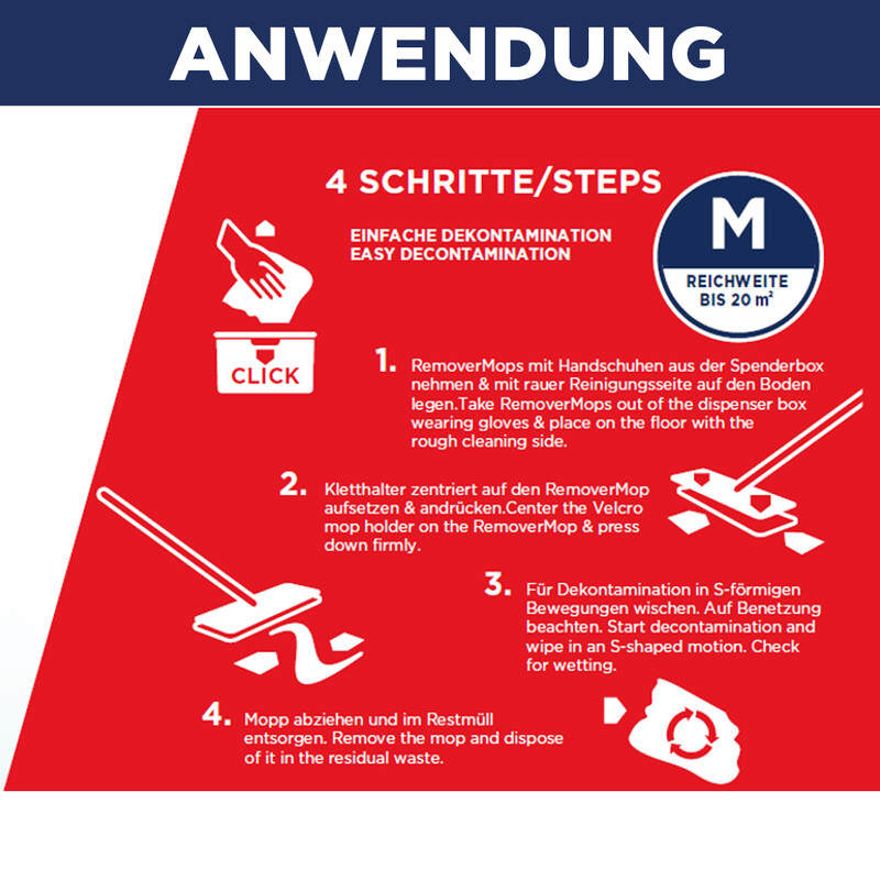 Ready-to-use disposable mops for disinfection and cleaning of floors and hard surfaces. DesiMops disinfection mops are comprehensively effective: sporicidal, virucidal, bactericidal, fungicidal under high load. Range per mop 20 m². Disinfection solution made of low-odor peracetic acid is 99.8% biodegradable and not a hazardous substance.