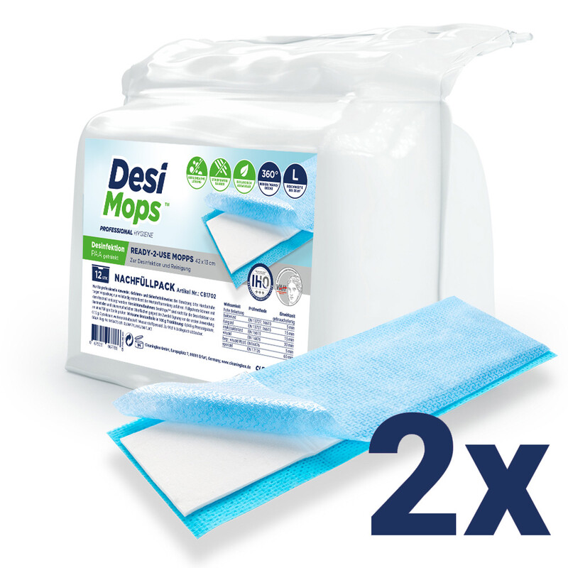 Gebrauchsfertige Einmal-Mopps zur Desinfektion und Reinigung von Böden und harten Oberflächen. DesiMops Desinfektionsmopps sind umfassend wirksam: Sporizid, viruzid, bakterizid, fungizid unter hoher Belastung. Reichweite je Mopp 35 m². Desinfektionslösung aus geruchsarmer Peressigsäure ist zu 99,8 % biologisch abbaubar und kein Gefahrstoff. Die DesiMops sind VAH zugelassen und wurden nach neuesten EN-Normen getestet.