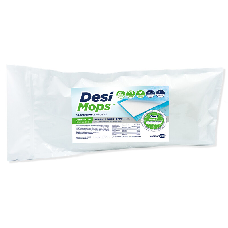 Gebrauchsfertige Einmal-Mopps zur Desinfektion und Reinigung von Böden und harten Oberflächen. DesiMops Desinfektionsmopps sind umfassend wirksam: Sporizid, viruzid, bakterizid, fungizid unter hoher Belastung. Reichweite je Mopp 35 m². Desinfektionslösung aus geruchsarmer Peressigsäure ist zu 99,8 % biologisch abbaubar und kein Gefahrstoff. Die DesiMops L sind VAH zugelassen und wurden nach neuesten EN-Normen getestet.