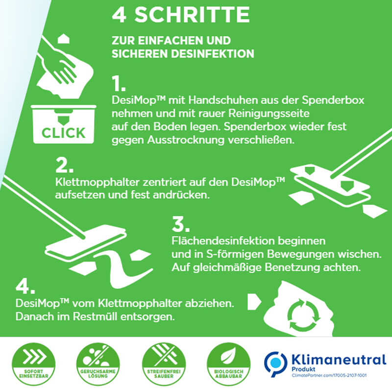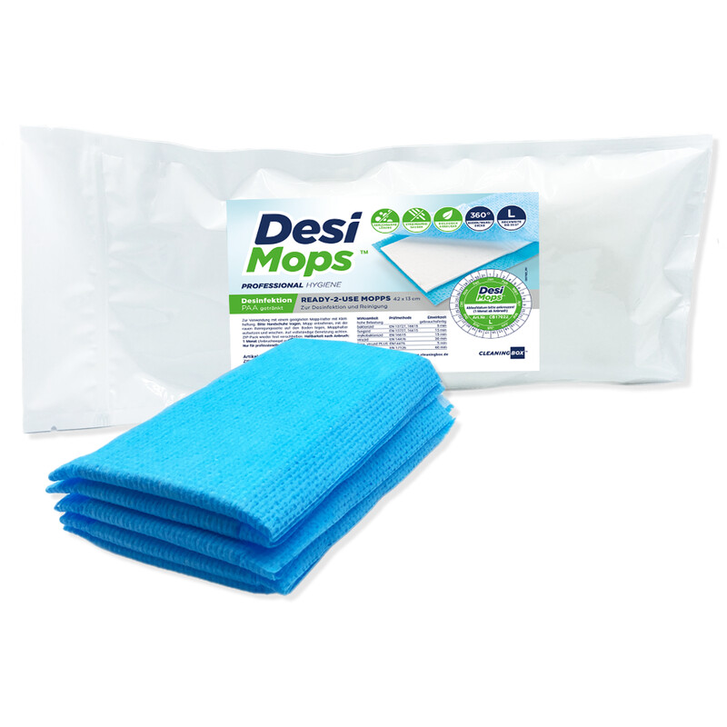 Ready-to-use disposable mops for disinfection and cleaning of floors and hard surfaces. DesiMops disinfection mops are comprehensively effective: sporicidal, virucidal, bactericidal, fungicidal under high load. Range per mop 35 m². Disinfection solution made of low-odor peracetic acid is 99.8% biodegradable and not a hazardous substance.