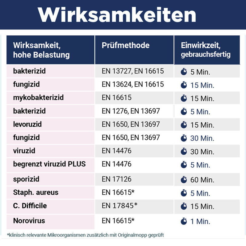 The innovative active ingredient solution based on low-odor peracetic acid (PAA) has been extensively tested microbiologically under high load. The disinfectant solution is sporicidal according to new EN 17126, fully virucidal and fungicidal. In addition to the prescribed practical tests according to EN 16165 with the standard cloth, clinically relevant microorganisms (Staph. aureus, noroviruses, C. difficile) were also tested with the original disposable mop in accordance with the 4-field test according to EN 16615.