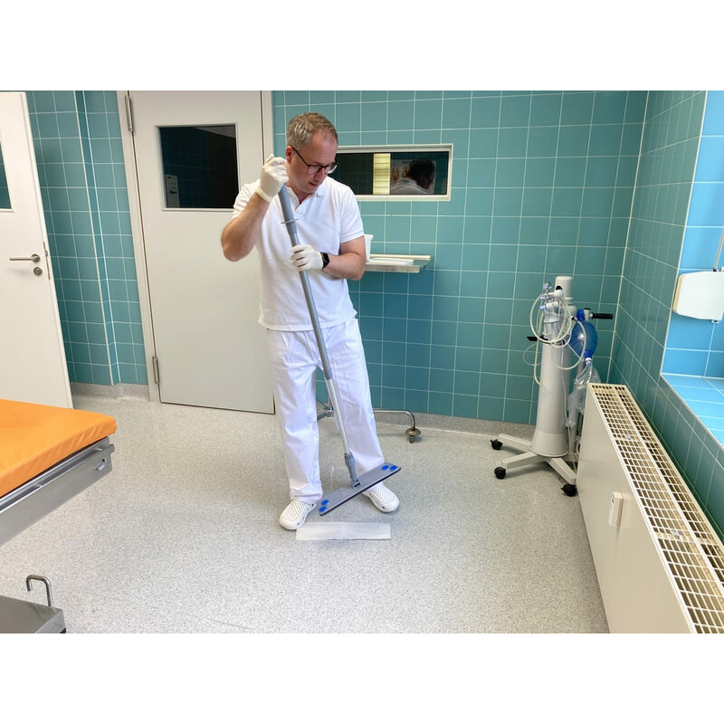 Die innovative Wirkstofflösung auf Basis geruchsarmer Peressigsäure (PAA) ist mikrobiologisch unter hoher Belastung umfassend geprüft. Die Desinfektionslösung ist sporizid nach neuer EN 17126, voll viruzid und fungizid. Neben den vorgeschriebenen praxisnahen Versuchen nach EN 16165 mit dem Standardtuch wurden zusätzlich klinisch relevante Mikroorganismen (Staph. aureus, Noroviren, C. difficile) in Anlehnung an den 4-Felder-Test nach EN 16615 mit dem Original Einmalmopp geprüft.