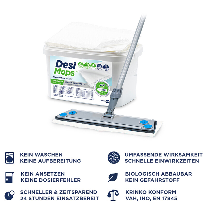 Ready-to-use disposable mops for disinfection and cleaning of floors and hard surfaces. DesiMops disinfection mops are comprehensively effective: sporicidal, virucidal, bactericidal, fungicidal under high load. Range per mop 20 m². Disinfection solution made of low-odor peracetic acid is 99.8% biodegradable and not a hazardous substance.