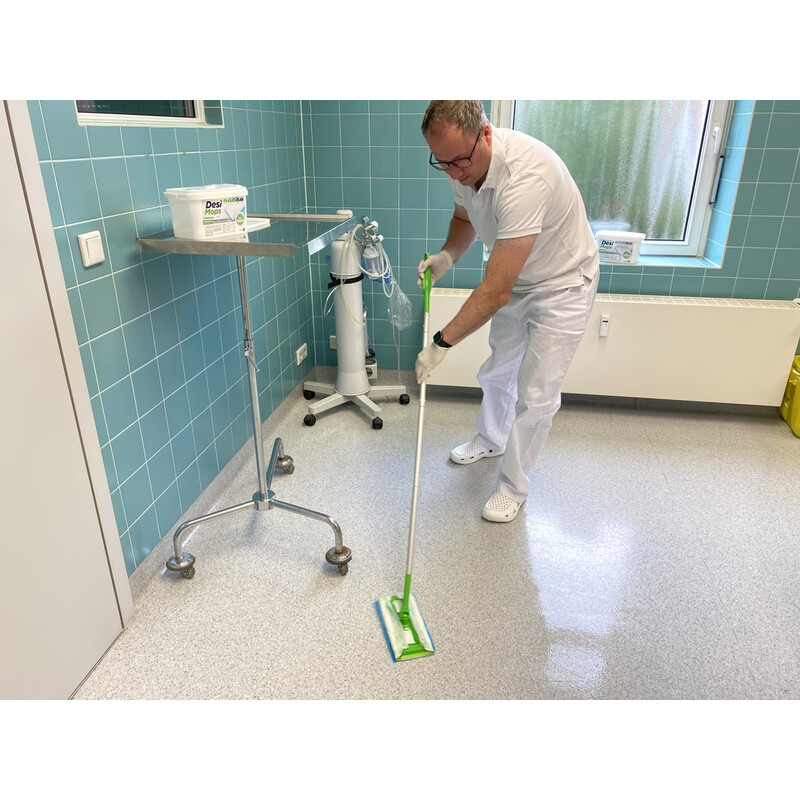 Gebrauchsfertige Einmal-Mopps zur Desinfektion und Reinigung von Böden und harten Oberflächen. DesiMops Desinfektionsmopps sind umfassend wirksam: Sporizid, viruzid, bakterizid, fungizid unter hoher Belastung. Reichweite je Mopp 20 m². Desinfektionslösung aus geruchsarmer Peressigsäure ist zu 99,8 % biologisch abbaubar und kein Gefahrstoff. Die DesiMops S sind als Desinfektions-Upgrade kompatibel zu etablierten Bodenwischer-Systemen, wie dem Swiffer Bodenwischer-System, und können flexibel am Boden, Wänden, Decken und Oberflächen eingesetzt werden. Die DesiMops sind VAH und IHO zugelassen und wurden nach neuesten EN-Normen getestet.