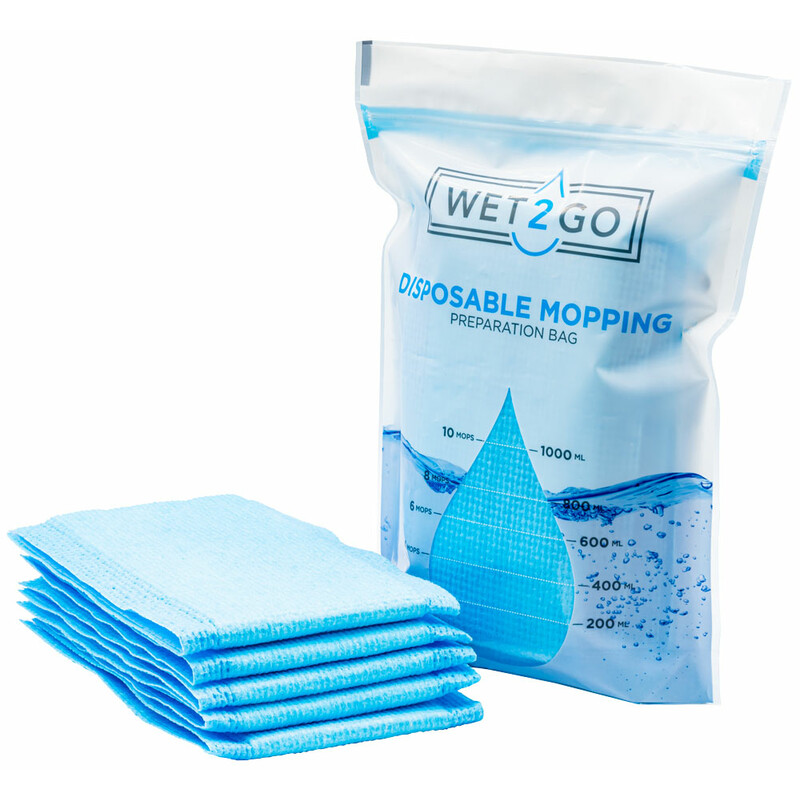 The cleaning mops can be soaked with any detergent, disinfectant or just water in a bucket or our soaking bags. Per mop = 170 ml of liquid. The mops have excellent cleaning and dirt binding properties. Compared to reusable mops, due to the mop's low own weight of 19 grams, you only need a maximum of 170 ml of impregnation liquid with the same range and better cleaning results. The cleaning mop is designed for hygienic single use, but can also be washed out several times under running water.