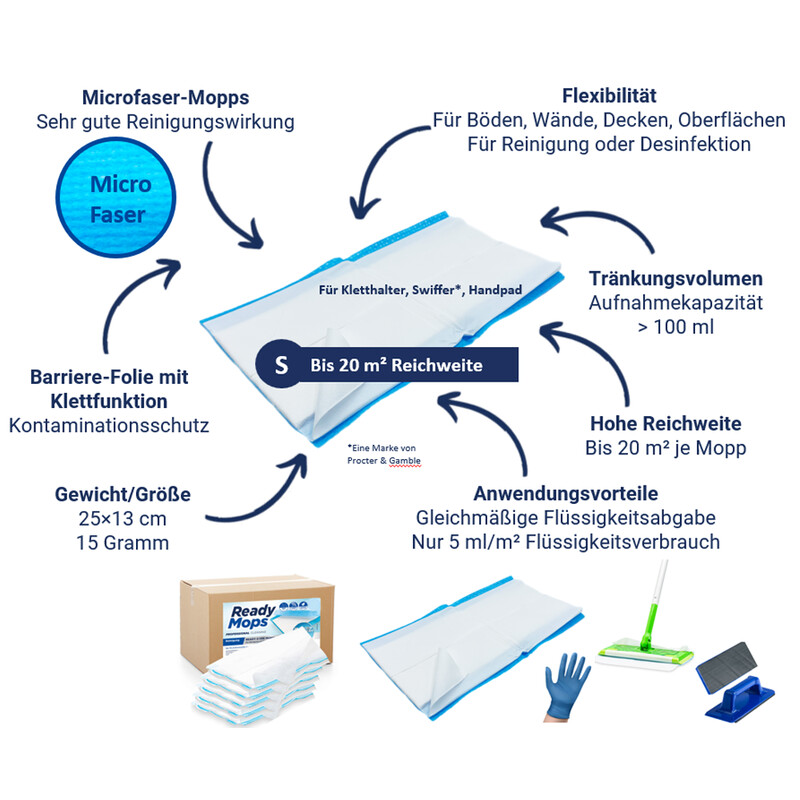 Die Reinigungsmopps lassen sich mit jeden Reinigungsmittel, Desinfektionsmittel oder nur mit Wasser in einem Eimer oder unseren Tränkungsbeuteln tränken. Je Mopp = 100 ml Flüssigkeit. Die Mopps verfügen über hervorragende Reinigungseigenschaften und Schmutzbindeeigenschaften. Im Vergleich zu Mehrweg-Mopps braucht man durch das geringe Eigengewicht des Mopps von 13 Gramm nur maximal 100 ml Tränkungsflüssigkeit bei gleicher Reichweite und besseren Reinigungsergebnissen. Der Reinigungsmopp ist für die hygienische Einmalverwendung gedacht, kann aber auch unter fließendem Wasser mehrmals ausgewaschen werden.
