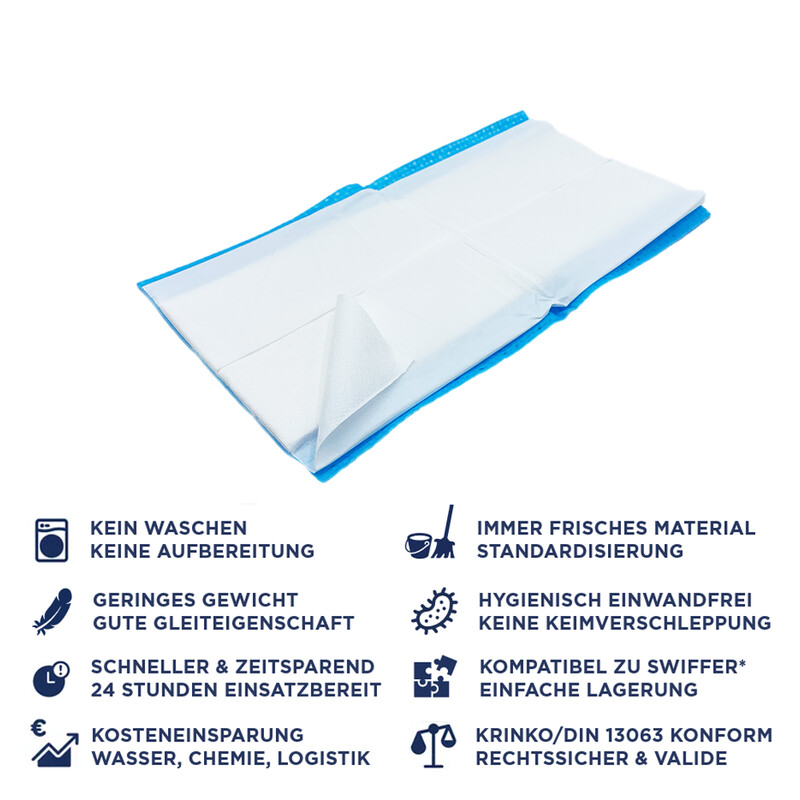 Die innovativen tränkbaren Reinigungsmopps (Einmalmopps, Einmalmops, Einwegmopps, Einwegmops, Einmalwischbezüge) wurden speziell für die einfache, schnelle und kraftvolle Reinigung von wasserfesten Böden, wie Fliesen, Laminat, Parkett, PVC, Stein oder Linoleum entwickelt. Sie sind als Tages- oder Kurzzeitbezug ideal für die flexible Nutzung bei limitiertem Zugang zu Waschmöglichkeiten und können mit allen Reinigungsverfahren, wie Eimer, Presse, Sprühmethode eingesetzt werden.