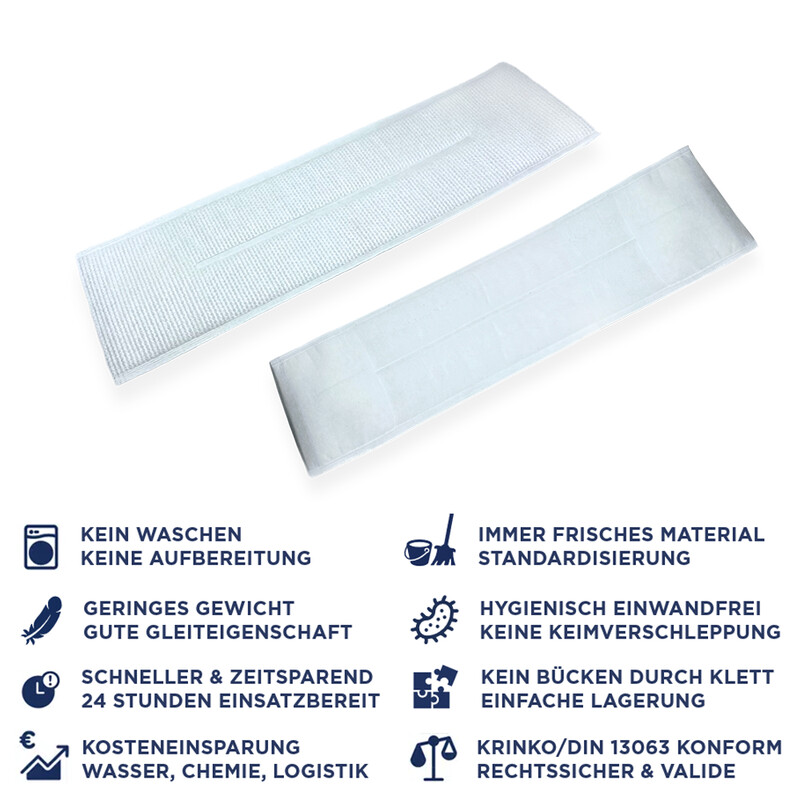 - Gesundheitsschutz: Ergonomisches Arbeiten durch perfekte Gleitfähigkeit und leichtes Arbeitsmaterial. Einweg-Reinigungsmopps müssen nicht mehr gepresst und ausgewrungen werden. Hierdurch können Belastungserkrankungen im Zusammenhang mit Reinigungsarbeiten, wie das Karpaltunnelsyndrom oder Sehnenscheidenentzündungen vermieden werden.
