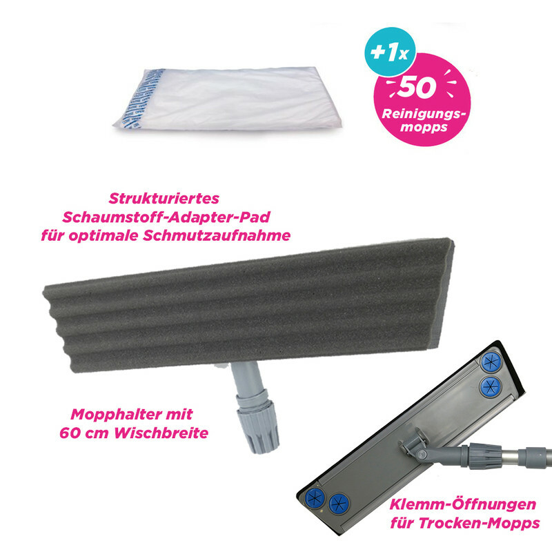 Durch das Erweiterungsset Trockenreinigung können die Wischsets I & II für die Boden-Trockenreinigung mit Trocken-Mopps bzw. Staubbindetüchern erweitert werden. Einfach am kompatiblen Sprüh-Moppstiel bzw. Teleskop-Moppstiel den gelieferten 60 cm Mopp-Halter inkl. Schaumstoff-Adapter-Pad für die Trockenreinigung montieren und loslegen.