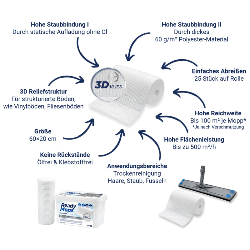Premium dry cleaning mops or dust binding cloths with high relief structure and super-adhesive electrostatic dust-binding layer for the removal of loose dirt and dust (fine dirt, coarse dirt) on smooth floor surfaces, but also uneven floors, such as tiled floors, slate, non-slip floors.