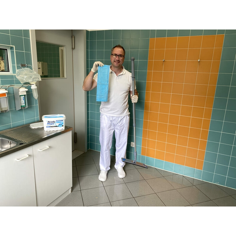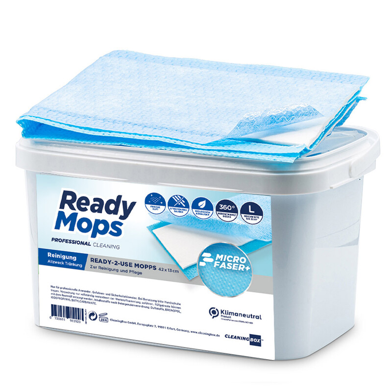 Vorgetränkte ReadyMops Allzweck für die einfache, schnelle und kraftvolle Reinigung von wasserfesten Böden, wie Fliesen, Laminat, Parkett, PVC oder Linoleum. Die feuchten 5-in-1 Reinigungsmopps bestehen aus drei innovativen Schichten aus einer schmutzbindenden Microfaser-Schicht zur Reinigung, einer mit 100 ml Reinigungsflüssigkeit getränkten saugfähige Zellstoff-Schicht sowie eine Schutz-Schicht gegen die Kontamination des Mopp-Halters mit Schmutzwasser. Die ReadyMops Allzweck duften nach Sommerfrische und enthalten bereits die perfekt vordosierte Kombination aus Reinigungsmitteln, Feuchtigkeit, Duft- und Pflegemitteln. Ein Mopp reicht für ca. 35 m² Fläche und kann entweder im Einmalgebrauch entsorgt werden oder unter fliesenden Wasser ausgewaschen und nachbefeuchtet werden.