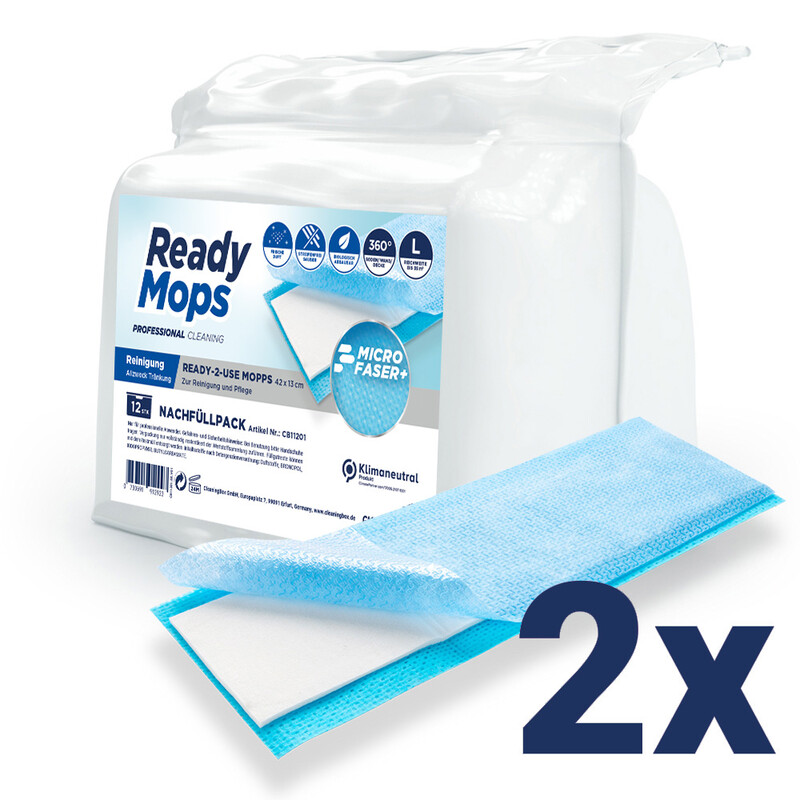 Vorgetränkte ReadyMops Allzweck für die einfache, schnelle und kraftvolle Reinigung von wasserfesten Böden, wie Fliesen, Laminat, Parkett, PVC oder Linoleum. Die feuchten 5-in-1 Reinigungsmopps bestehen aus drei innovativen Schichten aus einer schmutzbindenden Microfaser-Schicht zur Reinigung, einer mit 160 ml Reinigungsflüssigkeit getränkten saugfähige Zellstoff-Schicht sowie eine Schutz-Schicht gegen die Kontamination des Mopp-Halters mit Schmutzwasser. Die ReadyMops Allzweck duften nach Sommerfrische und enthalten bereits die perfekt vordosierte Kombination aus Reinigungsmitteln, Feuchtigkeit, Duft- und Pflegemitteln. Ein Mopp reicht für ca. 35 m² Fläche und kann entweder im Einmalgebrauch entsorgt werden oder unter fliesenden Wasser ausgewaschen und nachbefeuchtet werden.