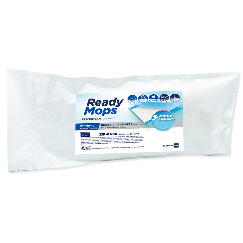 Pre-impregnated all-purpose ReadyMops for easy, quick and powerful cleaning of waterproof floors such as tiles, laminate, parquet, PVC, stone or linoleum. The moist 5-in-1 ReadyMops consist of three innovative layers: a dirt-binding microfibre layer for cleaning, an absorbent cellulose layer impregnated with 100 ml cleaning fluid and a protective layer to prevent the mop holder from being contaminated with dirty water. The ReadyMops All Purpose have the scent of summer freshness and already contain the perfectly pre-dosed combination of cleaning agents, moisture, fragrance and care products. One mop is sufficient for an area of approx. 35 m²; and can either be disposed of as a disposable item or washed and remoistened under running water.