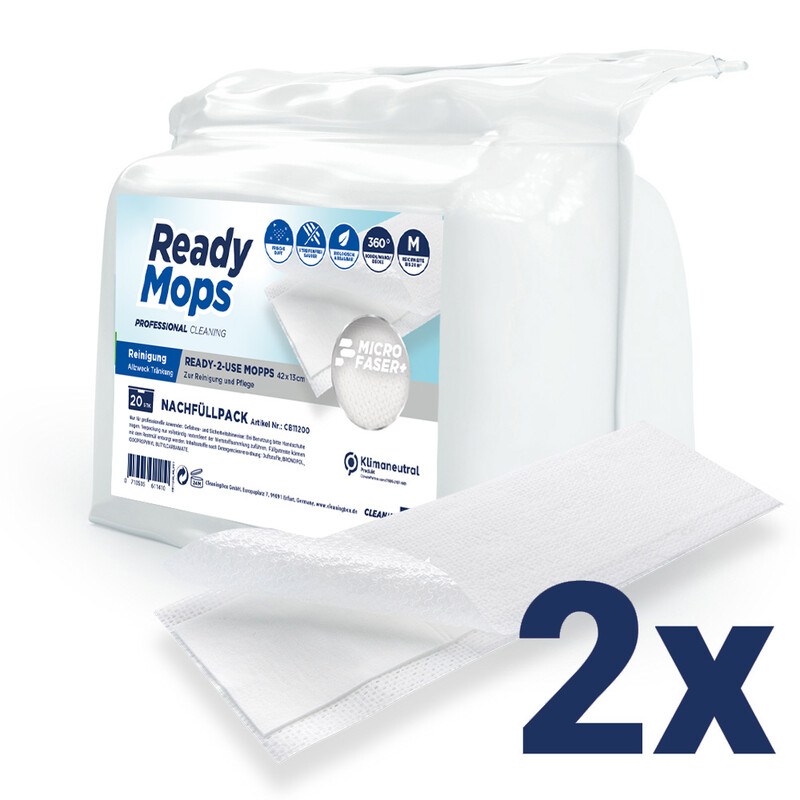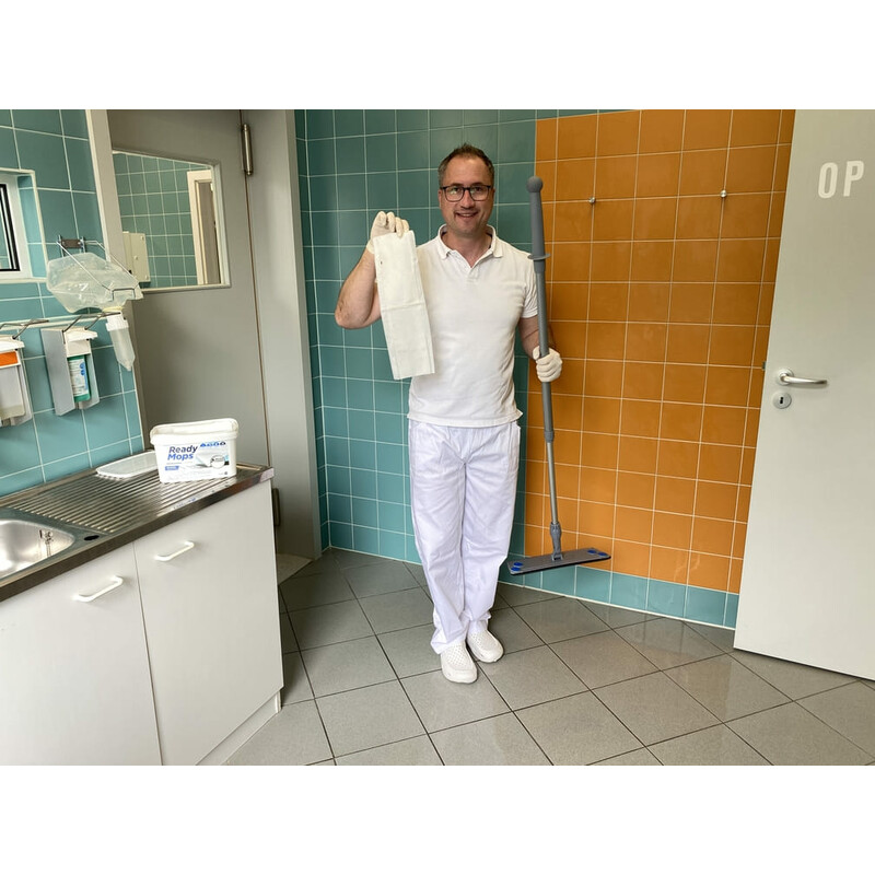 Pre-impregnated ReadyMops all-purpose for easy, quick and powerful cleaning of waterproof floors such as tiles, laminate, parquet, PVC, stone or linoleum. The moist 5-in-1 ReadyMops consist of three innovative layers: a dirt-binding microfibre layer for cleaning, an absorbent cellulose layer impregnated with 100 ml cleaning fluid and a protective layer to prevent the mop holder from being contaminated with dirty water. The ReadyMops All Purpose have the scent of summer freshness and already contain the perfectly pre-dosed combination of cleaning agents, moisture, fragrance and care products. One mop is sufficient for an area of approx. 20 m²; and can either be disposed of as a disposable item or washed and remoistened under running water.