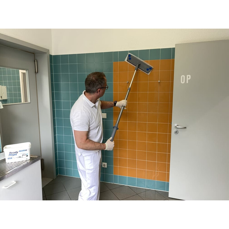 Vorgetränkte ReadyMops Allzweck für die einfache, schnelle und kraftvolle Reinigung von wasserfesten Böden, Wänden und Decken, wie Fliesen, Laminat, Parkett, PVC oder Linoleum. Die feuchten 5-in-1 Reinigungsmopps können in der Hand als Tuch, mit Hand-Mopp-Halter oder Bodenwischern bekannter Hersteller eingesetzt werden. Die ReadyMops bestehen aus drei innovativen Schichten aus einer schmutzbindenden Microfaser-Schicht zur Reinigung, einer mit 100 ml Reinigungsflüssigkeit getränkten saugfähige Zellstoff-Schicht sowie eine Schutz-Schicht gegen die Kontamination des Mopp-Halters mit Schmutzwasser. Die ReadyMops Allzweck duften nach Sommerfrische und enthalten bereits die perfekt vordosierte Kombination aus Reinigungsmitteln, Feuchtigkeit, Duft- und Pflegemitteln. Ein Mopp reicht für ca. 20 m² Fläche und kann entweder im Einmalgebrauch entsorgt werden oder unter fliesenden Wasser ausgewaschen und nachbefeuchtet werden.