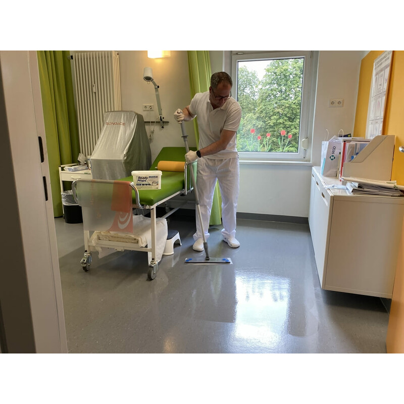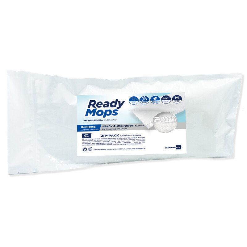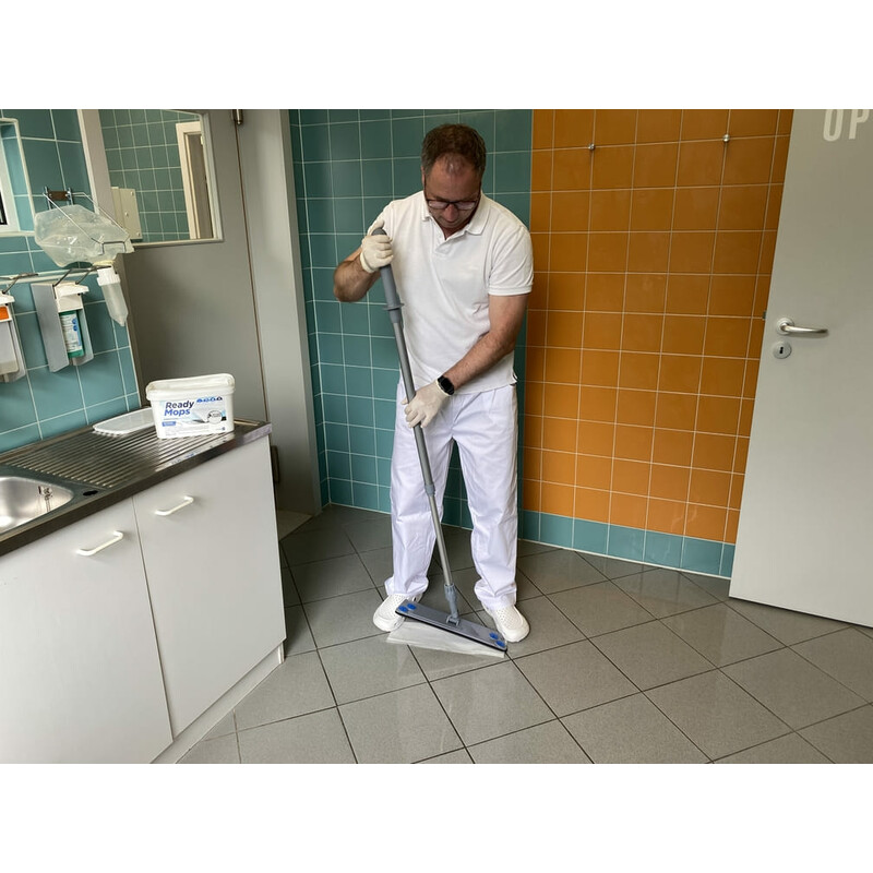 Pre-impregnated all-purpose ReadyMops for easy, quick and powerful cleaning of waterproof floors such as tiles, laminate, parquet, PVC, stone or linoleum. The moist 5-in-1 ReadyMops consist of three innovative layers: a dirt-binding microfibre layer for cleaning, an absorbent cellulose layer impregnated with 100 ml cleaning fluid and a protective layer to prevent the mop holder from being contaminated with dirty water. The ReadyMops All Purpose have the scent of summer freshness and already contain the perfectly pre-dosed combination of cleaning agents, moisture, fragrance and care products. One mop is sufficient for an area of approx. 20 m²; and can either be disposed of as a disposable item or washed and remoistened under running water.