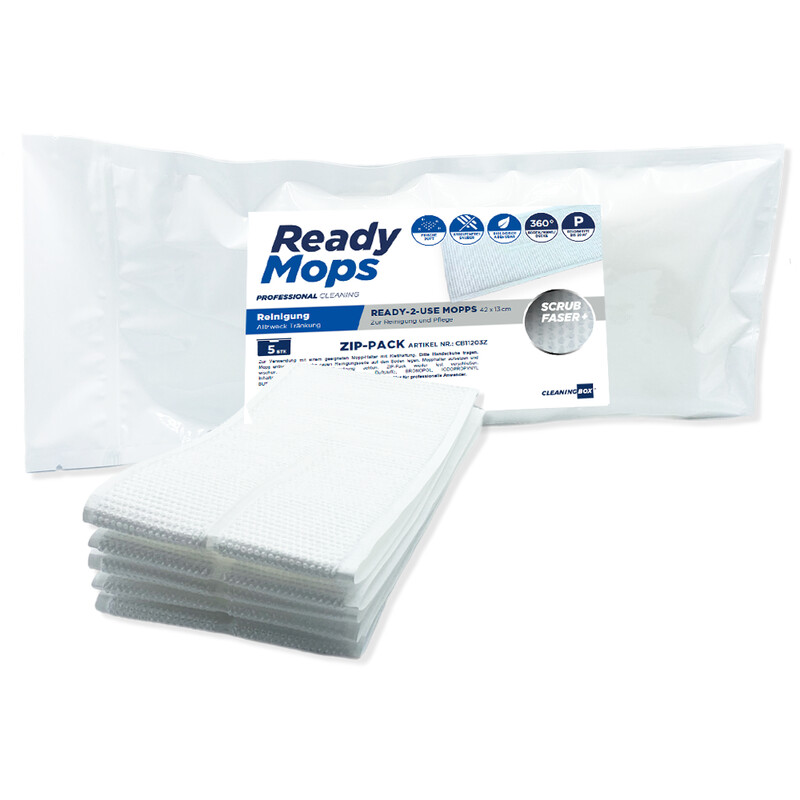 Pre-impregnated all-purpose ReadyMops for easy, quick and powerful cleaning of waterproof floors such as tiles, laminate, parquet, PVC, stone or linoleum. The moist 5-in-1 ReadyMops consist of three innovative layers: a dirt-binding microfibre layer for cleaning, an absorbent cellulose layer impregnated with 100 ml cleaning fluid and a protective layer to prevent the mop holder from being contaminated with dirty water. The ReadyMops All Purpose have the scent of summer freshness and already contain the perfectly pre-dosed combination of cleaning agents, moisture, fragrance and care products. One mop is sufficient for an area of approx. 20 m²; and can either be disposed of as a disposable item or washed and remoistened under running water.