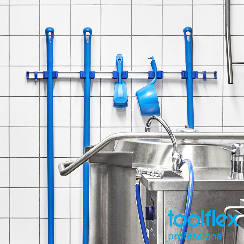 Das neue patentierte System Toolflex One vereint unterschiedliche Stieldurchmesser von 15-35 mm in einer einzigen Universalhalterung. Hier können unterschiedlichste Reinigungsgeräte, wie Besen, Moppstiele etc. an der Wand befestigt werden. Das offene hygienische Design und die glatte Oberfläche der Halterung ermöglichen eine einfache Reinigung.
