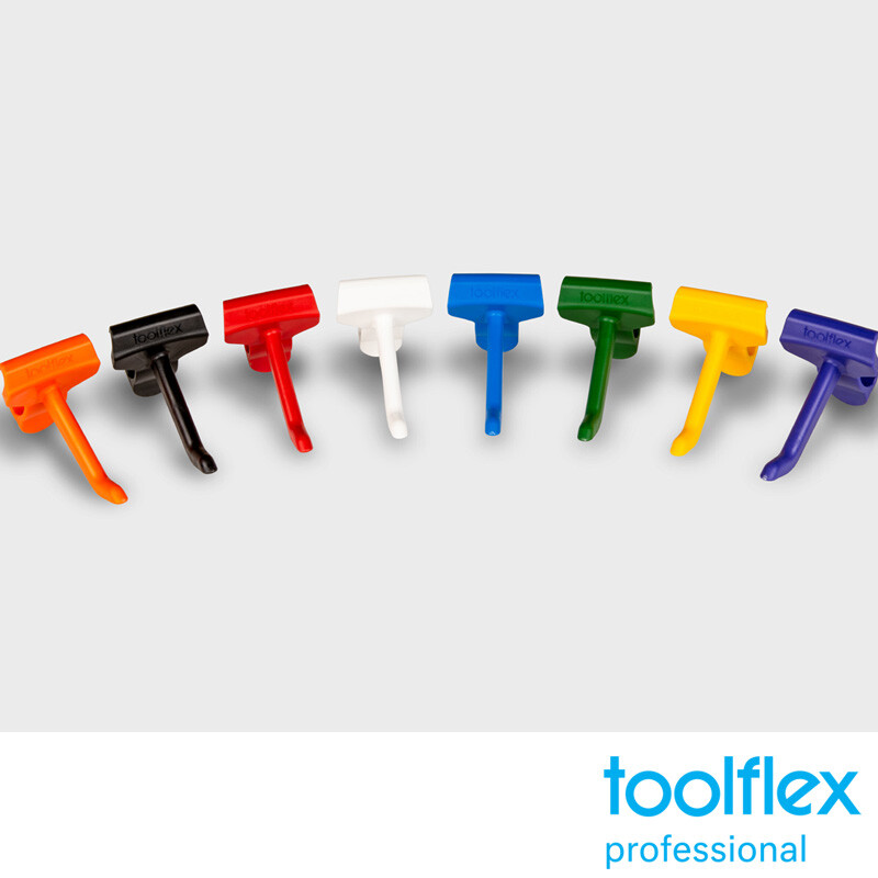 The Toolflex One appliance holder system sets new standards in the field of hygiene. Toolflex One was developed with special attention to hygiene aspects and user-friendliness. With their colourful Scandinavian design, Toolflex hooks are the ideal complement to the Toolflex wall brackets and fit perfectly on the Toolflex aluminium rails. With the click n'go function, the hooks can be easily attached to the Toolflex One rail without any tools. The hooks can also be easily removed from the rail without tools and placed elsewhere on the Toolflex One rail.