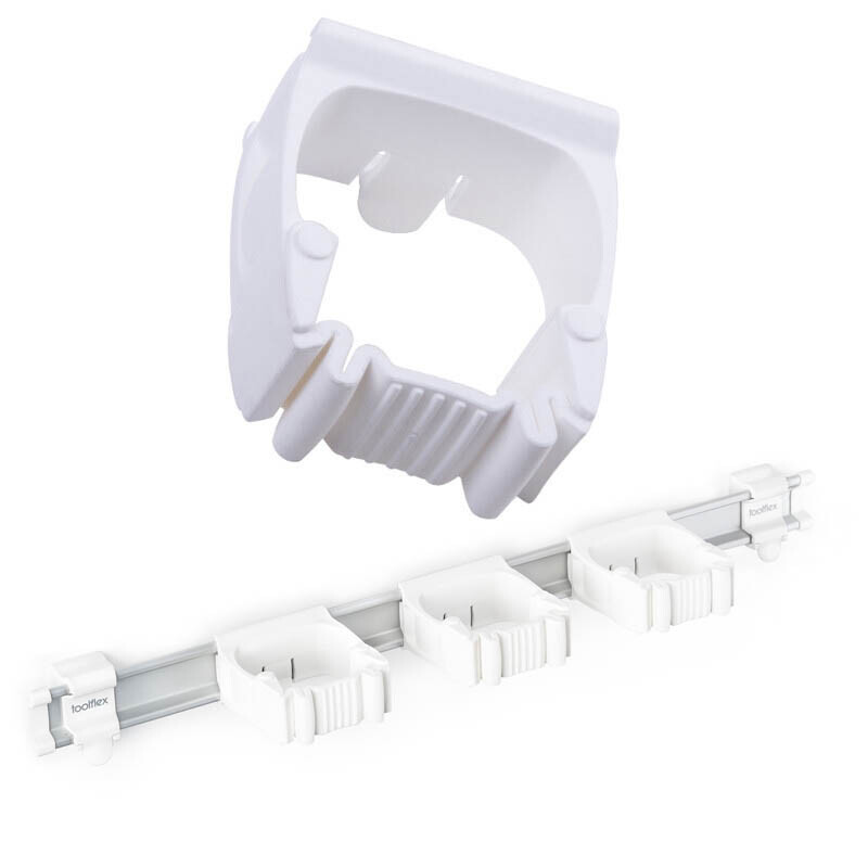 The new patented system Toolflex One combines different diameters of stems from 15-35 mm in a single universal bracket. A wide variety of cleaning tools such as brooms, mop handles etc. can be mounted on the wall. The open hygienic design and the smooth surface of the holder make cleaning easy.