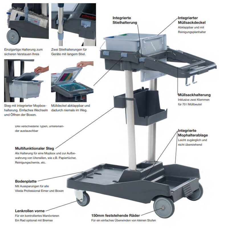 Der Reinigungswagen wurde speziell für die verschiedenen Vileda Professional Bodenreinigungssysteme entwickelt und mit den 3 Boxen für aufbereitete Wischbezüge eingesetzt werden.