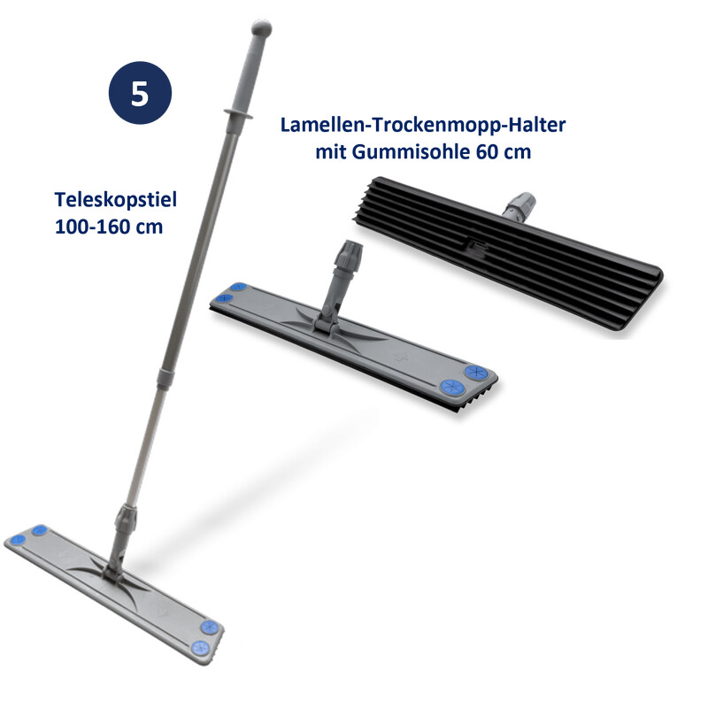 Das Wischset Trockenreinigung 60 cm mit Lamellen-Trockenmopp-Halter aus Gummi & Teleskopstiel wurde speziell für die schnelle und effiziente Boden-Trockenreinigung auf glatten aber auch unebenen Böden entwickelt. Der Gummi des Lamellen-Trockenmopp-Halter ist leicht zu reinigen und zu desinfizieren. Mit einer Wischbreite von 60 cm und den Klemmöffnungen auf der Oberseite des Klettmopp-Halters kann es hervorragend mit allen StaubMops bzw. Staubebindetüchern verwendet werden. Mit diesem Wischset bekommen Sie sehr gute Qualität zu einem günstigen Preis.