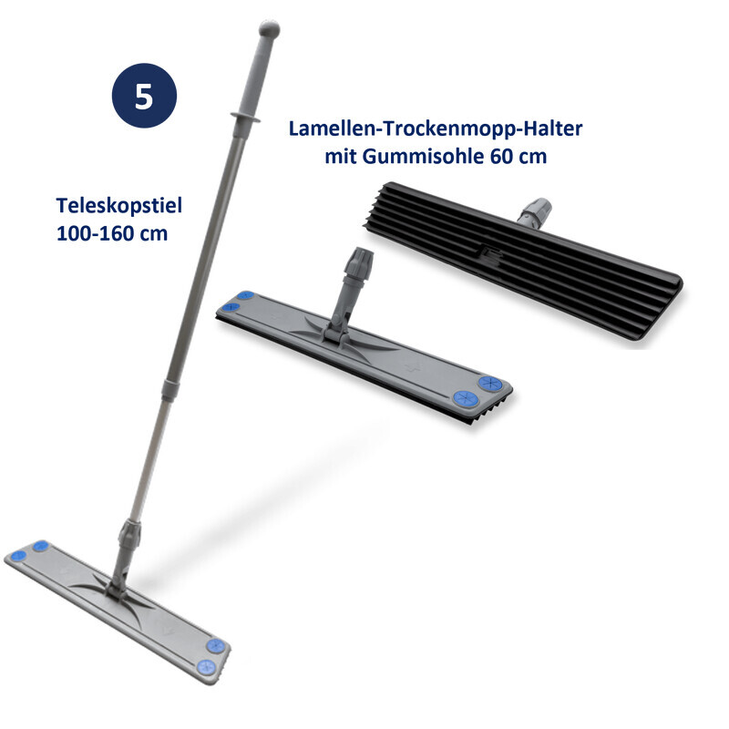 The Wiper Set III with telescopic mop handle and foam adapter pad has been specially developed for fast and efficient dry floor cleaning on smooth but also uneven floors. With a wiping width of 60 cm and the clamp openings on the top of the Velcro mop holder, it can be used excellently with all disposable dry mops or dust binding cloths. To get started immediately, each mop set comes with a 50 pack of our disposable Dry Mops Basic. With this wiping set you get a top wiping set for dry cleaning or dust-binding wiping in very good quality at a reasonable price.