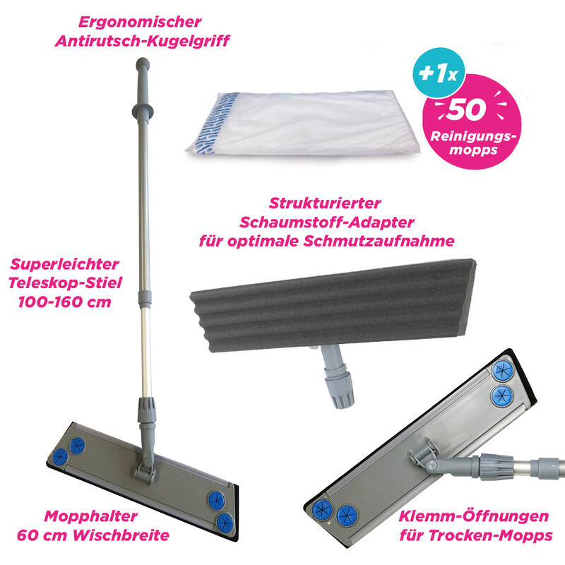 Das Wischset Trockenreinigung 60 cm mit Schaumstoff-Pad & Teleskopstiel wurde speziell für die schnelle und effiziente Boden-Trockenreinigung auf glatten aber auch unebenen Böden entwickelt. Mit einer Wischbreite von 60 cm und den Klemmöffnungen auf der Oberseite des Klettmopp-Halters kann es hervorragend mit allen StaubMops bzw. Staubebindetüchern verwendet werden.